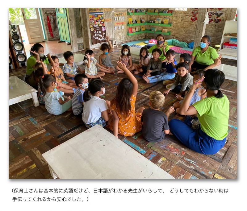 バリの環境は英語で話しかけられることが多く、子供たちも「英語でなんて言うんだろう?」と努力してたり、おままごとでも、人形で遊ぶ時、「スラマッパギ~」とかインドネシア語で会話させてたり。